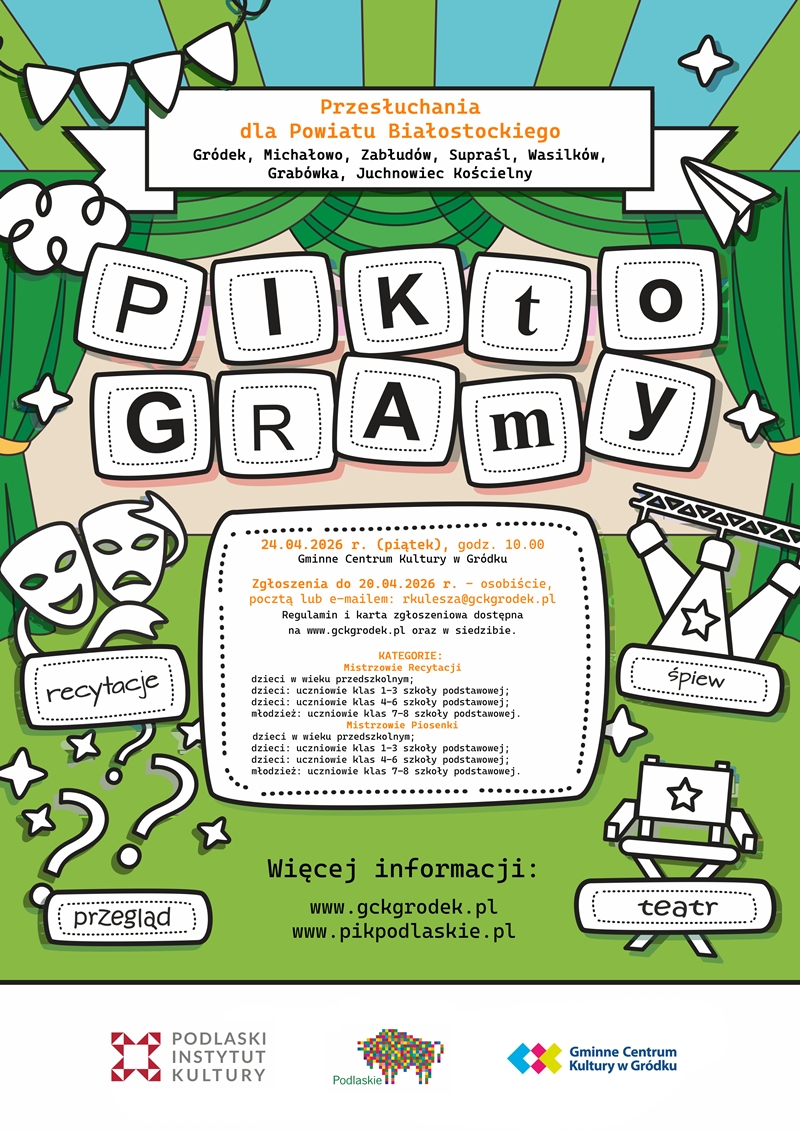 Miło nam poinformować, że zostaliśmy gospodarzami Przesłuchań Powiatowych VI WOJEWÓDZKIEGO PRZEGLĄDU AMATORSKIEJ TWÓRCZOŚCI TEATRALNEJ i SZTUK WIZUALNYCH „PIKtoGRAmy” 2026, którego organizatorem jest Podlaski Instytut Kultury.